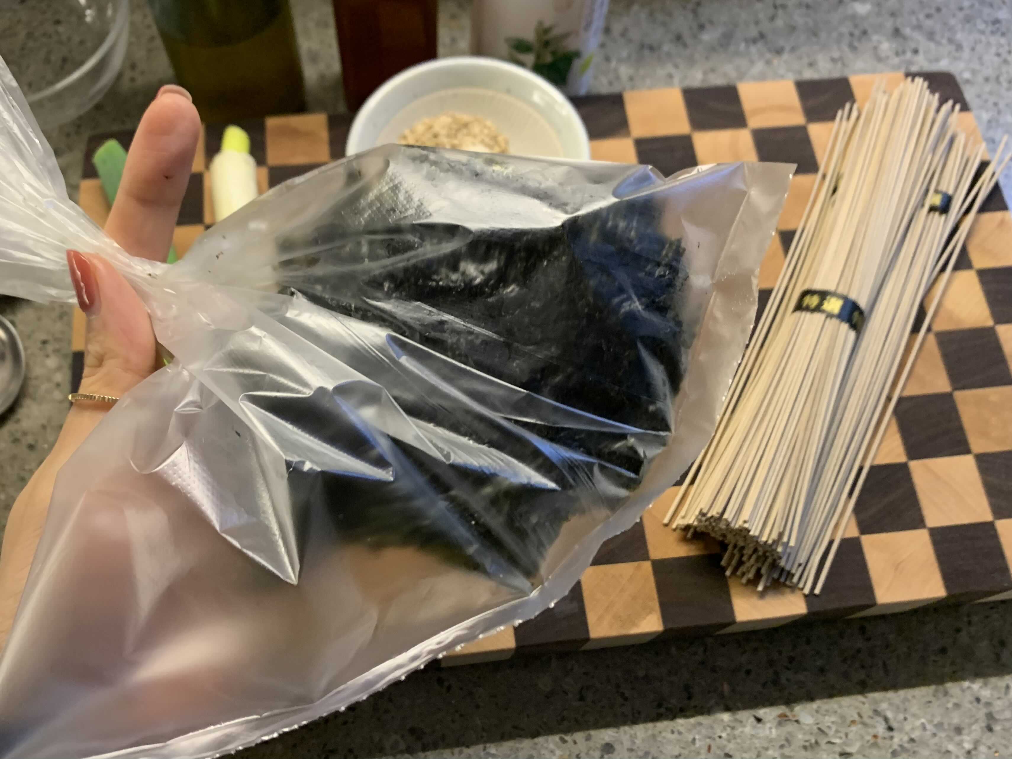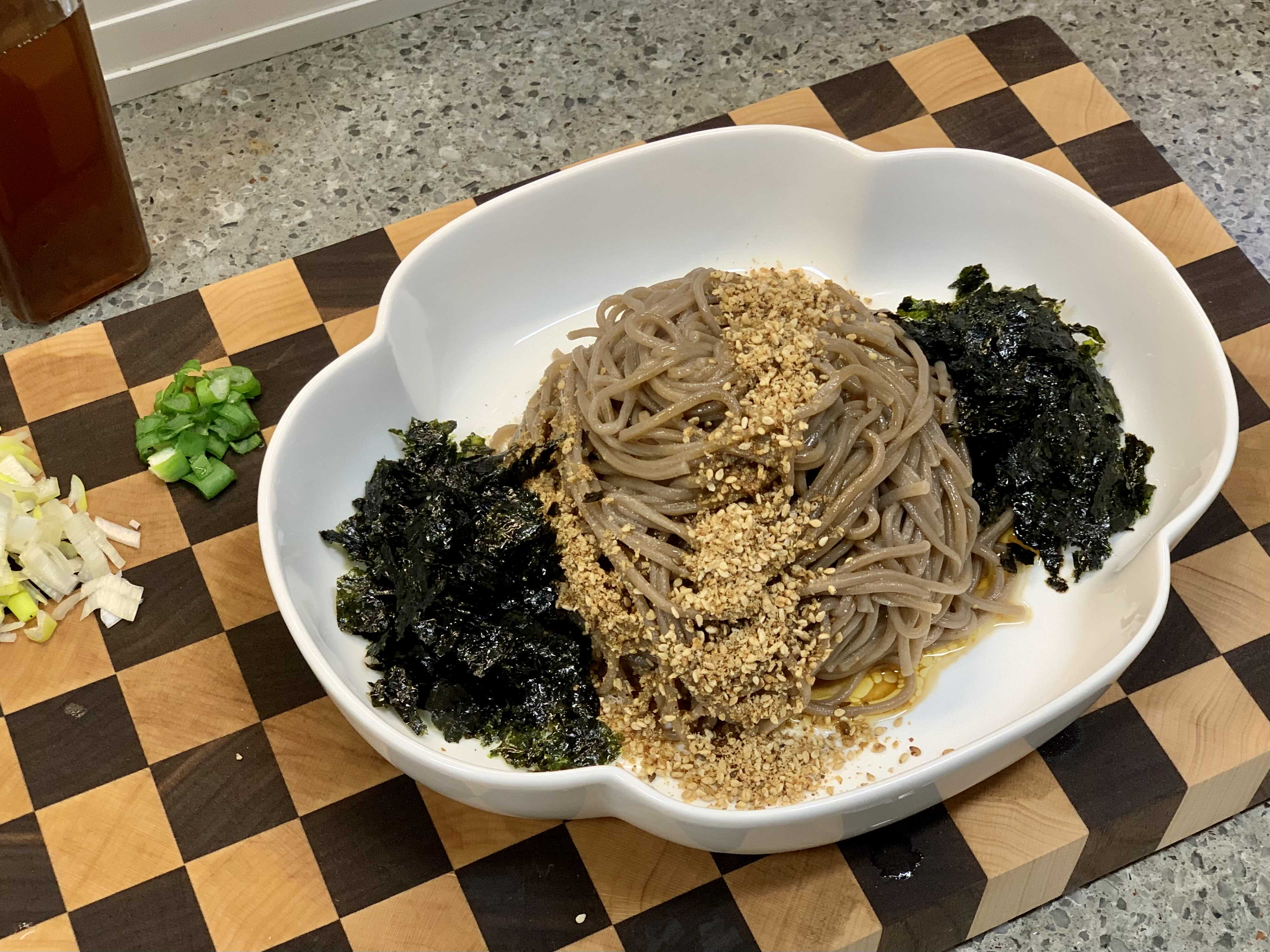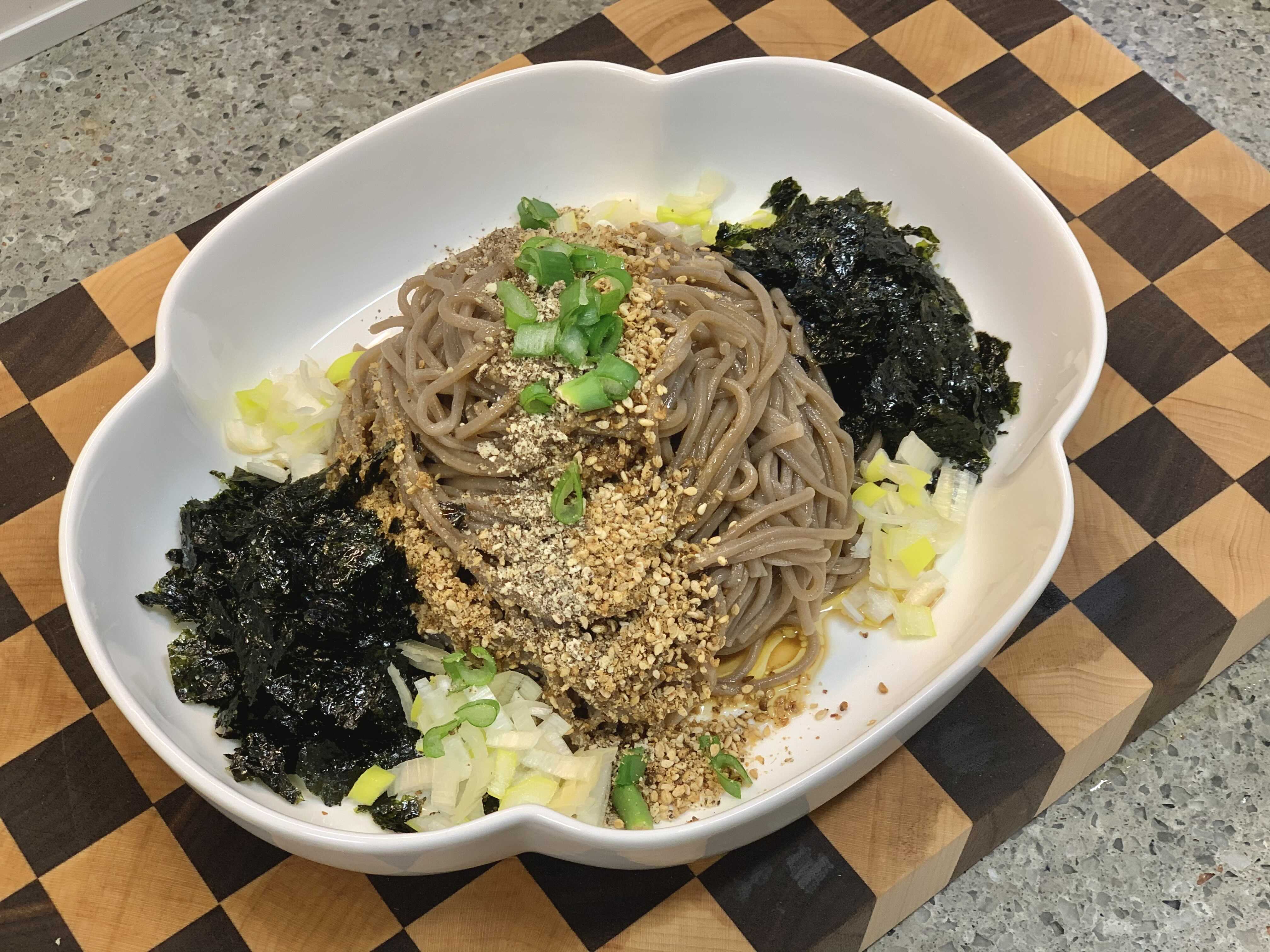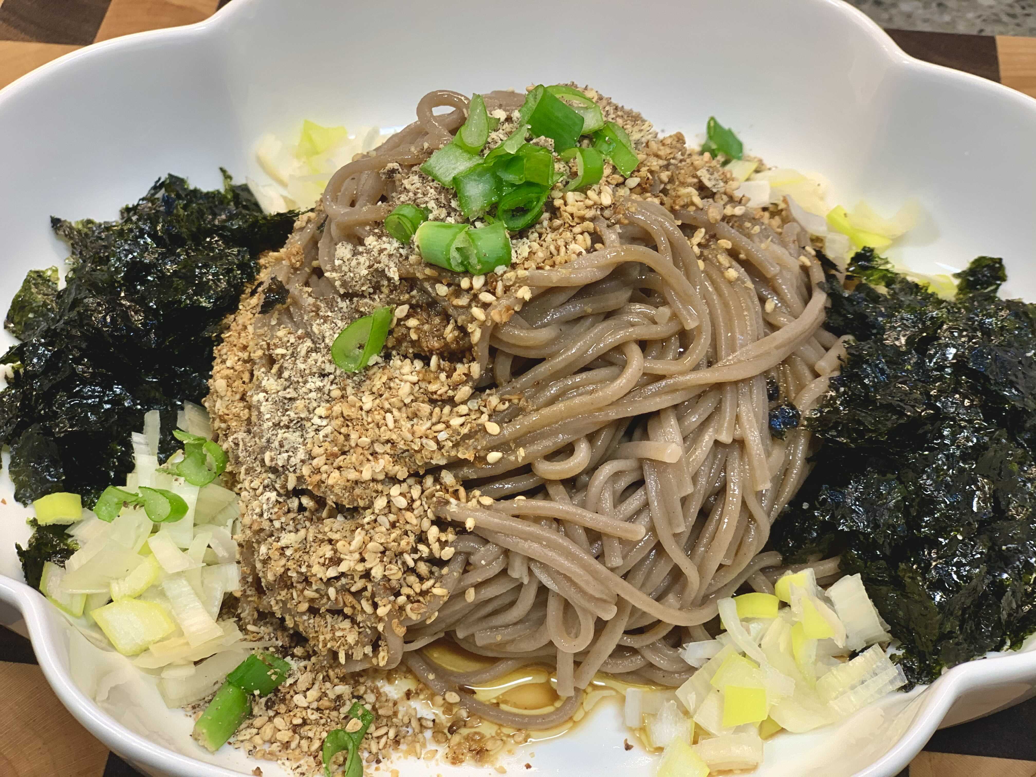 # 잘 갈은 깨, 들깨가루 한스푼정도를 면 위에